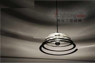 彎曲縈繞的燈罩讓人以為是蚊香的理念,這款的吊燈設(shè)計采取了生活中常見的因素,在第一眼即可拉緊與欣賞使用者的距離。然而你可以說蚊香的造型有點庸俗,但一定不會說此燈的設(shè)計庸俗——一旦它在暗夜里發(fā)出明亮的光,發(fā)揮照明的本職作用,便可見到圈圈光線如水紋般蕩漾在墻上,整個居室已成光影的奇妙世界。
