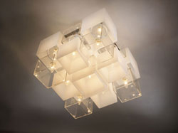 設(shè)計(jì)理念:這盞吊燈的設(shè)計(jì)概念源自立方體形態(tài),利用了兩種比例及高低的立方體組合而成。它的外形像古典吊燈,但卻用了亞加力膠來代替水晶。這會帶出一種較時尚與整齊的感覺,亦會令別人對古典吊燈有一番新的觀感。