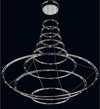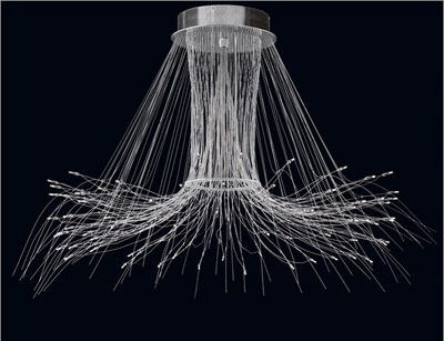 吊燈有著啟發(fā)性設計和強烈沖擊感。精細閃耀的重復線條向周圍擴散,就像王冠。彎曲和拉緊的線條相結合,使其特別適合于所表現(xiàn)的氛圍。