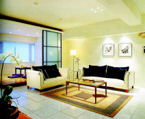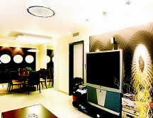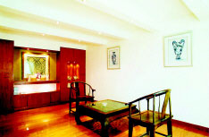 與客廳相連的茶室里用有節(jié)律分布的筒燈來代替室內(nèi)主射燈,從而使規(guī)則排布的條形假梁閃現(xiàn)出幾分靈動(dòng)的氣息,與棕色木地板、滕椅、方桌相和諧,展示柜的處理極為簡(jiǎn)潔,在櫻桃木的映襯下,幾盞精巧的內(nèi)置燈將主人的愛物和盤托出,平和、大度和休閑的氣氛便油然而生。