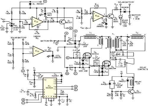圖1所示太陽(yáng)能燈電路是一種低損耗電路,使用一只7W四引腳CFL(小型熒光燈)和一塊12V、7-Ahr密封免維護(hù)電池。逆變器的效率大于85%,靜態(tài)電流小于2mA。它有一個(gè)帶電池過(guò)放電保護(hù)功能和過(guò)充電保護(hù)功能的并聯(lián)充電控制器。低靜態(tài)電流、過(guò)放電保護(hù)功能和過(guò)充電保護(hù)功能三者確保電池使用壽命很長(zhǎng)。逆變器的預(yù)熱功能可以避免CFL兩端變黑,從而延長(zhǎng)其使用壽命。這一電路可在農(nóng)村地區(qū)用作一種可靠小巧的便攜式光源,在城市用作應(yīng)急燈系統(tǒng)。并聯(lián)充電控制器電路包括IC1(低電流2.5V電壓基準(zhǔn)源LM385)和IC2(LM324比較器)。配有電阻R1 ~ R8和三極管Q1的IC2A可防止電池過(guò)放電。