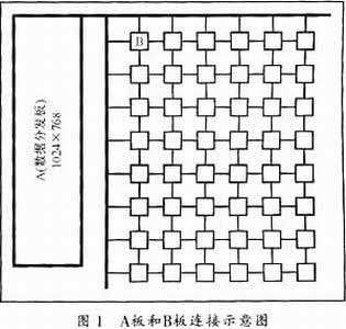 全彩是指顯示屏上每像素的顏色顯示采用24bit,共顯示16 777 216種顏色。而現(xiàn)今許多圖形顯示只支持8 bit顏色值,只能顯示256種顏色。本設(shè)計的全彩LED屏可與計算機VGA顯示屏實時同步輸出顯示,并可任意播放圖片、文字、廣播、電視、錄像、VCD以及各種三維動畫。此外還能完全適應(yīng)戶外各種惡劣性環(huán)境(如防腐,防水,防潮,防雷,抗震等)。LED屏的顯示采用1024×768像素,數(shù)據(jù)量為1024×768×60(幀)×24=1132462080 bit,每個掃描板能控制128×128像素,所以完整顯示A板的數(shù)據(jù)需要8×6=48塊掃描板,A板的LVDS信號一共使用6路,每路四對(CLOCK+R-C-BDATA(3對));B板則使用兩路,一路輸入,一路輸出,每路都由(CLOCK+R-G-BDATA (3對))構(gòu)成。圖1所示是A板和B板的連接示意圖,其中A板為數(shù)據(jù)分發(fā)板,B板為掃描板。