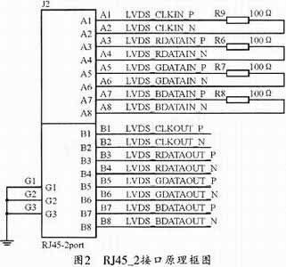 圖2為RJ45_2接口電路連接圖。使用LVDS信號傳輸時,在接收端應(yīng)有4個100Ω的匹配電阻與差分線阻抗相匹配,以減少阻抗不匹配所導致的共模噪聲增加和電磁干擾(EMI)。值得注意的是,在走線時,差分線的長度應(yīng)該保持一致,且差分線應(yīng)彼此盡量靠近以減少反射,并應(yīng)盡量減少信號路徑中的過孔數(shù)量與阻抗的不均勻,此外,還要把LVDS和TTL信號層分開以防止串擾。