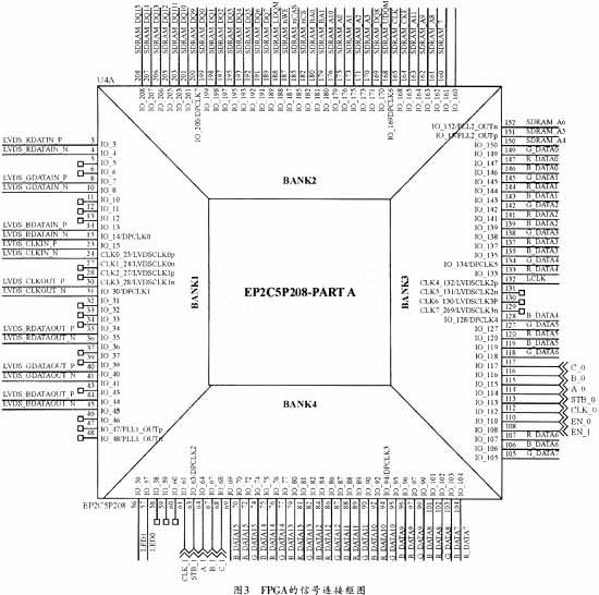 圖3為FPGA的連接電路。本全彩LED控制系統(tǒng)之所以選用FPGA作為測試平臺,其原因首先是FPGA可以快速轉(zhuǎn)向最終原型,其次是它的可再編程能力強,可以通過軟件而不是硬件來滿足設(shè)計的改進,而最重要的一點則是因為FPGA提供了大量的資源,包括SDRAM驅(qū)動、ZBT SRAM驅(qū)動和快速傳輸邏輯接口(LVDS)等。EP2C5Q208C8一共有208個管腳,分成4個BANK,BANK1的I/O接口用于差分信號線,BANK2上的I/O接口與SDRAM相連接,BANK3和BANK4用來連接LED顯示屏的數(shù)據(jù)和控制信號。