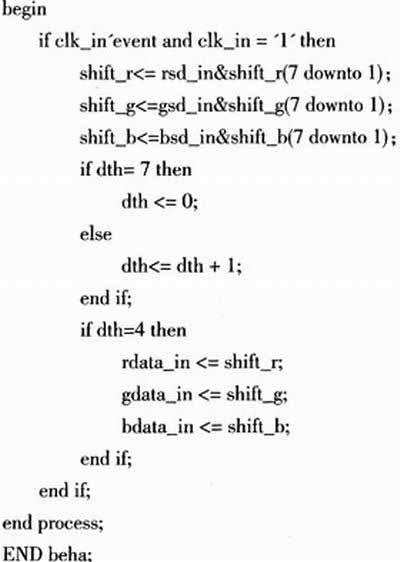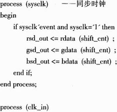 硬件電路連好之后,便可用VHDL語言編寫相應(yīng)的測試代碼??赏ㄟ^計數(shù)器生成RGB數(shù)據(jù)信號,然后把數(shù)據(jù)從FPGA經(jīng)差分線輸出,再經(jīng)過10米長的雙絞線輸入到FPGA,從而檢驗LVDS信號傳輸?shù)姆€(wěn)定性,其示意圖如圖4所示。部分VHDL代碼如下: