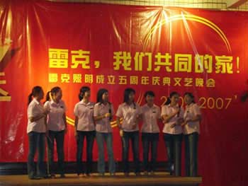 9月8日晚,佛山市雷克照明科技有限公司內(nèi)張燈結(jié)彩,喜氣洋洋,主題為“雷克——我們共同的家”五周年文藝晚會準(zhǔn)時拉開帷幕,雷克照明公司領(lǐng)導(dǎo)及全體員工共同出席了晚會。