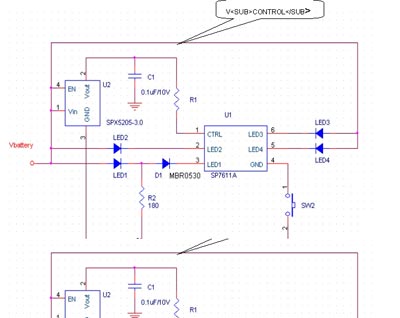 當SW1和SW2閉合時,U1和U3均工作,主燈LED1~LED5點亮,此時通過LDO SPX5205提供3V電源來設置LED1的電流。