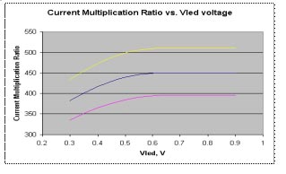 圖3:圖2電路的電流放大倍數(shù)與VLED電壓的關系。