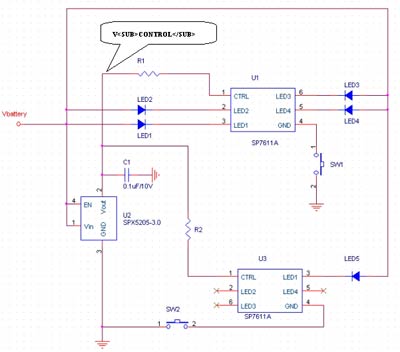 在圖2電路中,當SW1關閉,SW2打開時,副LED燈工作,流過LED1的電流ILED=(Vbattery-Vf)/R2,其中D1被用來防止電流通過芯片流到地。此時芯片SP7611A沒有工作,由于流過LED1的電流較小,所以工作時間可大于30小時。