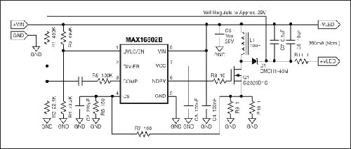 反激型LED驅(qū)動(dòng)器比較通用,因?yàn)樵摻Y(jié)構(gòu)可以用于輸入電壓高于或低于所要求的輸出電壓。此外,當(dāng)反激電路工作在非連續(xù)電感電流模式時(shí),能夠保持LED電流恒定,無需額外的控制回路。本應(yīng)用筆記所描述的電路基于高度集成的MAX16802 PWM LED驅(qū)動(dòng)器IC。