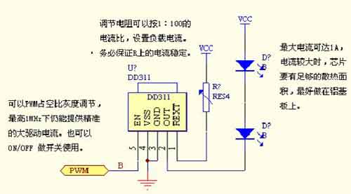 DD311 是一單通道輸出的LED恒流驅(qū)動(dòng)器,內(nèi)建電流鏡與電流開關(guān)組件,是專為驅(qū)動(dòng)大功率LED而設(shè)計(jì)的芯片.DD311可驅(qū)動(dòng)高達(dá)1安培的沈入電流(sink current),并可透過(guò)調(diào)整參考輸入電流(IREF)來(lái)任意設(shè)定輸出電流的大小.輸出電流值約為100倍的IREF,IREF可由調(diào)整外掛電阻或偏壓 (bias)電壓來(lái)設(shè)定.微調(diào)或使能偏壓電壓可校正LED間的亮度不一或?qū)崿F(xiàn)多顆LED間整體亮度同時(shí)調(diào)整.芯片的輸出端可承受高達(dá)36V的電壓,支持多顆大功率LED的串接應(yīng)用.內(nèi)建輸出使能端(Enable),可輕易地實(shí)現(xiàn)大功率LED的高灰階應(yīng)用。