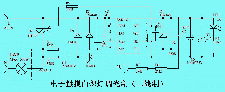 電路主要采用專門(mén)芯片SM7232制作而成,它通過(guò)人體觸摸M點(diǎn)觸摸片,控制白熾燈的開(kāi)關(guān)和調(diào)光,最大負(fù)載功率達(dá)500W。 LED最好裝在觸摸片附近,在黑夜中起到指示的作用. R6、R7從人體保安考慮,有意采用2個(gè)電阻。 |