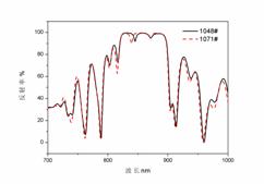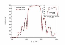 對于傳統(tǒng)紅黃光LED,這種厚度信息對DBR反射層信息的干擾也許可以忽略,但是對于RCLED影響卻相當(dāng)大,以至于不能準(zhǔn)確分析諧振腔的參數(shù)。一個實際RCLED結(jié)構(gòu)中包含被稱為電流擴展層的厚層,我們根本無法確定光學(xué)凹陷的位置,如圖2,RCLED全結(jié)構(gòu)的反射率曲線,兩個批次間隔20爐投片。