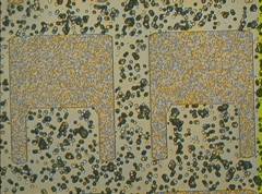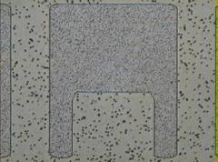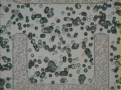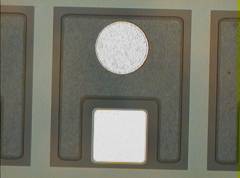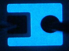 將經(jīng)過熱H3PO4腐蝕過的GaN材料制備成325um×375um的芯片,對其光電性能進(jìn)行測試。圖6與圖7是芯片在點(diǎn)亮前后的照片,從圖中可以看到,粗化后的GaN材料制成芯片后,其P電極及整個(gè)電流擴(kuò)展層表面較粗糙;芯片在5mA下點(diǎn)亮后,發(fā)現(xiàn)其電流可以擴(kuò)展均勻,并未產(chǎn)生局部發(fā)光現(xiàn)象。