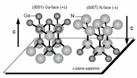 圖3給出了已刻蝕MESA平臺圖形的GaN材料,在210℃熱H3PO4中腐蝕5min后的表面形貌,從圖中我們可以看到,平臺上的P型GaN表面的凹坑較小而且濃密,而平臺下面的N型GaN表面的凹坑較大且較稀疏,導(dǎo)致該差異的主要原因取決于GaN材料的極性,圖4給出了GaN材料的極性結(jié)構(gòu)圖,通常Ga極性的GaN其表面不容易被腐蝕,而N極性的GaN表面較容易被腐蝕,主要原因是由于在腐蝕過程中,N極性結(jié)構(gòu)中的N原子容易被腐蝕介質(zhì)中的離子吸附解離,而Ga極性結(jié)構(gòu)則相反,導(dǎo)致較難腐蝕[3,4]。同時(shí)我們觀察到所出現(xiàn)的凹坑呈六邊形結(jié)構(gòu),該現(xiàn)象主要與GaN材料的六方形晶體結(jié)構(gòu)相關(guān)。