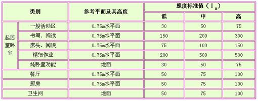 住宅室內(nèi)根據(jù)房間功能的不同,所要求的照度值也是有變化的,在做照明設(shè)計(jì)時(shí),應(yīng)該注意這一點(diǎn),不能一概而論。各 個(gè)功能房間的照度標(biāo)準(zhǔn)值如表1所示。