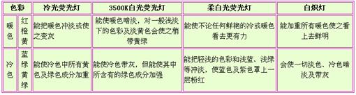 住宅裝修設(shè)計(jì)的基調(diào)應(yīng)以溫、冷色為主。但光源對(duì)顏色是具有影響的,住宅室內(nèi)照明按上述原則,大量采用的白熾燈、 熒光燈光源也不例外?,F(xiàn)把熒光燈。白熾燈對(duì)冷色與暖色的影響列表如表2。