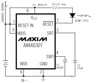 IC1可利用外部器件調(diào)節(jié)復位門限、復位時間及看門狗周期,它還提供一個由管腳設定的500倍乘功能,使看門狗周期增加500倍,借助于小電容產(chǎn)生長延時。圖示聯(lián)接表示當復位門限設置為最低值(1.22V),電池能量基本耗盡時,LED將持續(xù)點亮。