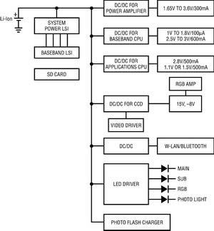 從圖1所示的方框圖中很容易理解,功能越多就需要在不同的功率級(jí)有更多的低壓輸出軌。而且,為多個(gè)顯示屏提供背光照明以及驅(qū)動(dòng)多種“指示”燈的需求也在增加。例如,手機(jī)具有一個(gè)主顯示器以用來(lái)觀看文本、圖形或照片,一個(gè)副顯示器來(lái)顯示時(shí)間、日期或來(lái)電號(hào)碼,一個(gè)用作照相機(jī)閃光燈或?yàn)橐曨l捕捉而置于手電筒模式的白光LED,以及一個(gè)照相機(jī)在使用時(shí)發(fā)出紅光的LED,這種情況并不罕見。