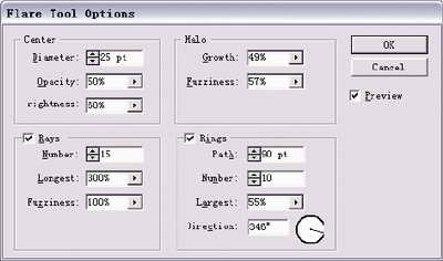 眩光對話框中不同的選項可以控制眩光的效果。創(chuàng)建眩光只需兩個步驟。當你確定眩光的中心點時,可控制它的中心點和放射線的數(shù)量;第二次單擊可以確定眩光的長度并且根據(jù)工具的設(shè)置創(chuàng)建光圈。眩光中填充顏色的透明度是可以改變的。
