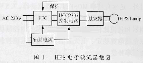 能夠?qū)崿F(xiàn)上述基本功能的方法有好多種,雖然許多廠商競相研制生產(chǎn),但能做到實用較為困難,因為,簡單的電路難以滿足要求,復(fù)雜的電路成本昂貴。通過對HPSL電子鎮(zhèn)流器的大量研究,本文介紹采用美國UNITROD公司專門為HIDL控制器設(shè)計的專用芯片UCC2305[2]制作的250W鎮(zhèn)流器,其基本的框圖如圖1所示。