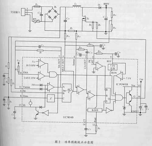 實現(xiàn)功率因數(shù)校正的方法很多[1][2][3][4][5],本案選擇UC3854B作為控制芯片,建立了固定頻率平均電流型有源功率因數(shù)校正電路,如圖2所示。在圖2中,整流橋B1、儲能電感L1、功率開關(guān)器件S1、升壓二極管D1、輸出濾波電容C1和電流取樣電阻R1組成了PFC主電路。