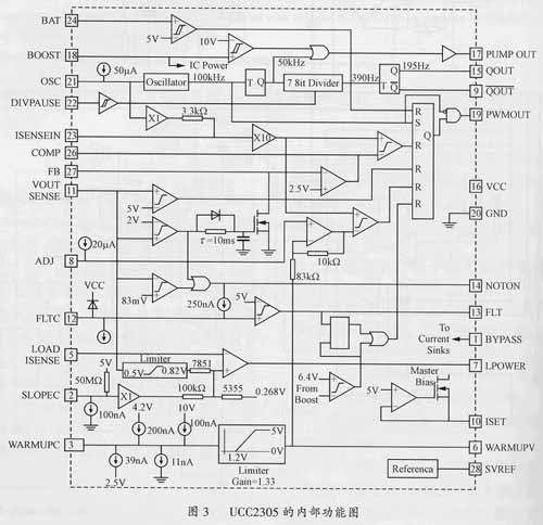 UCC2305的內(nèi)部結(jié)構(gòu)和功能如圖3所示。其單端驅(qū)動腳19(PWMOUT)可驅(qū)動正激式、反激式、升壓式、降壓式等不同類型的電路。主輸出腳9(QOUT)和腳15(QOUT)采用大電流推拉電路,可以驅(qū)動半橋和全橋電路。橋路輸出采用低頻交流,UCC2305內(nèi)置分頻器將單端驅(qū)動的頻率(一般取100kHz)除以512,得到195Hz的低頻,因此消除了聲共振。聲共振是HIDL在高頻電源供電時出現(xiàn)的放電電弧不穩(wěn)的現(xiàn)象,其機理是燈管內(nèi)壓力波的脈動從管內(nèi)壁反射回來,如果與高頻電流的脈動成分相位相同,則形成駐波,產(chǎn)生聲共振,輕則燈光抖動,重則燒毀燈管和鎮(zhèn)流器。