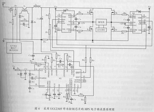 它主要由功率因數(shù)校正(PFC)電路、UCC2305控制電路、觸發(fā)電路和輔助電源4部分組成,電路較為簡單。