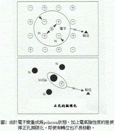 另一方面正孔也形成polaroon自我束縛狀,加上In原子與Ga原子的電氣陰性度的差,尤其是In原子周圍短距離型電位(potential),有可能產生強大的正孔捕捉。類似上述的電子與正孔的挶限化,會在奈米以下的原子大小范圍內產生,這種現象可視為InGaN化合物半導體的固有性質,換句話說注入發(fā)光組件活性層的載子,由于上述的捕捉效應被空間性的挶限,到達「發(fā)光殺手(killer)中心」的比率則相對的偏低,所以即使InGaN/GaN等化合物半導體具有大量的轉位格子缺陷,仍舊可作高效率的發(fā)光。