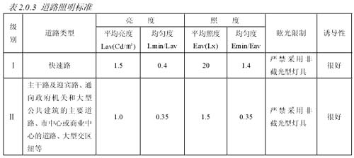 第2.0.3條 各級道路照明標(biāo)準(zhǔn)見表 2.0.3。