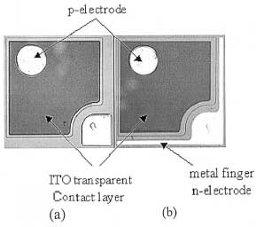 在LED芯片的制作過程中,要想得到光電性能良好的芯片,首要條件就是有一個合理的圖形設(shè)計,因為它決定了電流擴展的情況,只有均勻擴展的結(jié)構(gòu)才有著良好的穩(wěn)定性。電流的均勻擴展能夠避免對局部注入的電流相對過大而使那一點處的結(jié)溫局部過高致使p-n結(jié)燒毀,這對于工作電流較高的功率型芯片尤為重要。因此,要想得到好的穩(wěn)定性就要先有一個合理的圖形結(jié)構(gòu)。