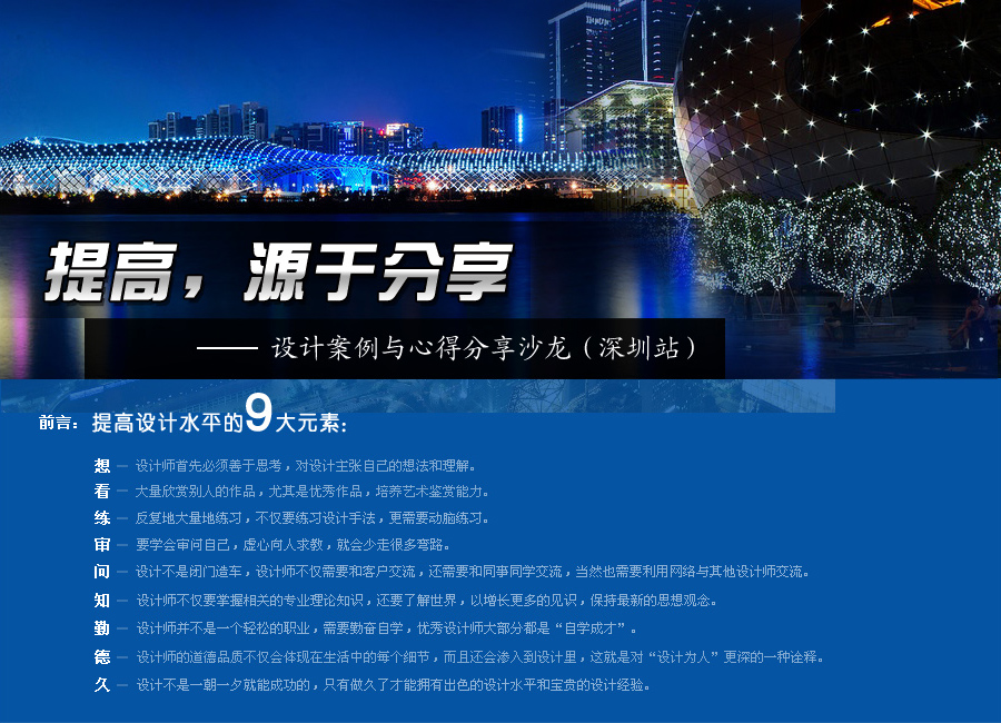 為建立設(shè)計(jì)師面對(duì)面交流學(xué)習(xí)的平臺(tái),協(xié)助設(shè)計(jì)師提高設(shè)計(jì)水平,阿拉丁照明網(wǎng)于9月17日在深圳舉辦設(shè)計(jì)案例與心得分享沙龍,各大設(shè)計(jì)師共同參與縱談?wù)彰髟O(shè)計(jì)! >>詳細(xì)請(qǐng)點(diǎn)擊