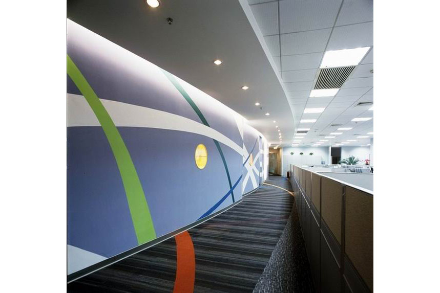 HP惠普上海總部辦公室裝修設(shè)計,設(shè)計元素融入了惠普的打印強項,接待處的波浪形吊頂與蜿蜒的墻壁造型仿佛一張連貫的紙,上面的圖案也像彩印一樣的多彩清晰?臻g利用大膽的圖像、色彩和材料,通過不同尋常的空間布局,創(chuàng)造出古怪特別的感覺。