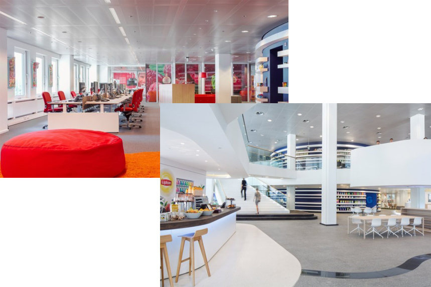 聯(lián)合利華歐洲品牌中心位于荷蘭鹿特丹,由Fokkema & Partners設(shè)計完成。該中心占地非常寬敞,分為上下兩層,以一個圓形的中央陳列館為中心,向四周展開,陳列館以深藍色為主色調(diào),上面鑲嵌著白色的弧形擱物架,架子上擺放著琳瑯滿目的聯(lián)合利華旗下的各種產(chǎn)品。