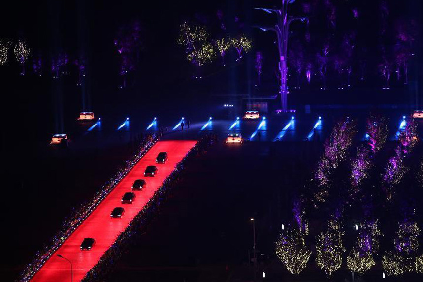11月10日晚,水立方、鳥巢周圍燈火璀璨。在水立方前方長長的迎賓大道上,出席亞太經(jīng)合組織領(lǐng)導(dǎo)人非正式會(huì)議的經(jīng)濟(jì)體領(lǐng)導(dǎo)人和代表的車隊(duì)迎著LED燈光形成的紅毯“踏浪而來”,紅毯之上還有許多星星般的點(diǎn)綴燈,場面華美。據(jù)央視報(bào)道,燈光紅毯與普通紅毯的區(qū)別在於,燈光紅毯更眩目、可移動(dòng)、可回收。此外,在沿途的每棵樹上,設(shè)計(jì)師還掛上了許多星星燈,美輪美奐的燈光秀彷佛照亮了整個(gè)天空。據(jù)燈光秀設(shè)計(jì)導(dǎo)演稱,這是大型表演燈光秀首次在室外進(jìn)行,使用了天然道具--銀杏葉來作為反映室外燈光效果變幻的主體。秋天的銀杏葉顏色淺淺,最易打造節(jié)日的氣氛。