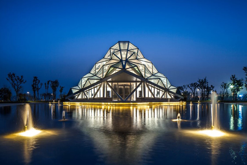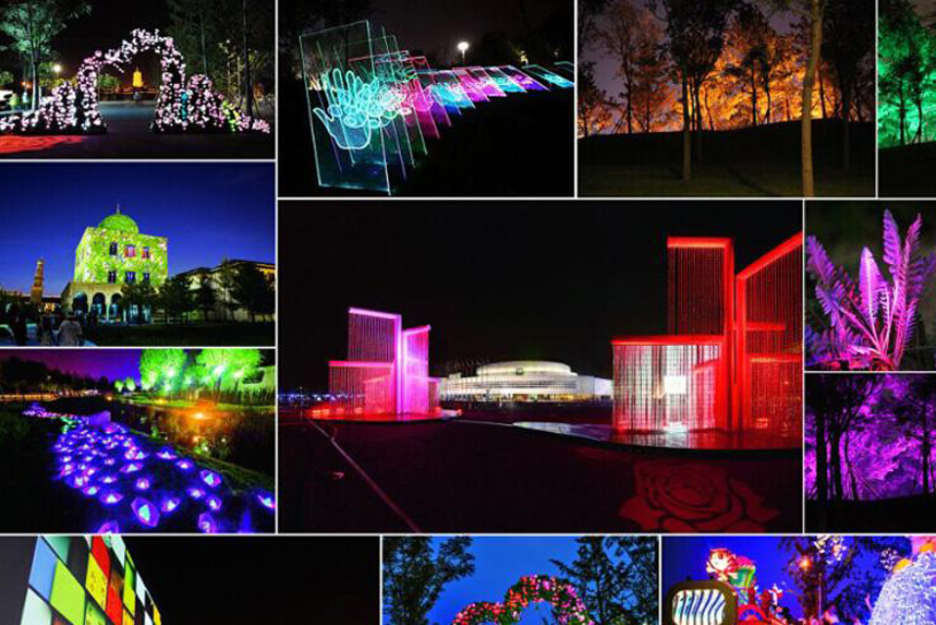 園博會(huì)南北呈長條形形狀,以園博軸為主干道,通貫全園,北端最高點(diǎn)位鷹山南端到園博濕地,主軸兩側(cè)分布各式各樣園林建筑,建筑造型各異,特色鮮明。園林花卉豐富多彩,南北這條主軸正好適合于做夜晚游走路線。北端的最高點(diǎn)上建筑永定塔有永定安瀾之意,綜合全園的這些特色。