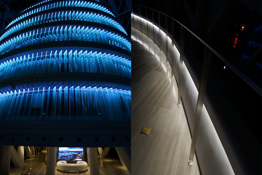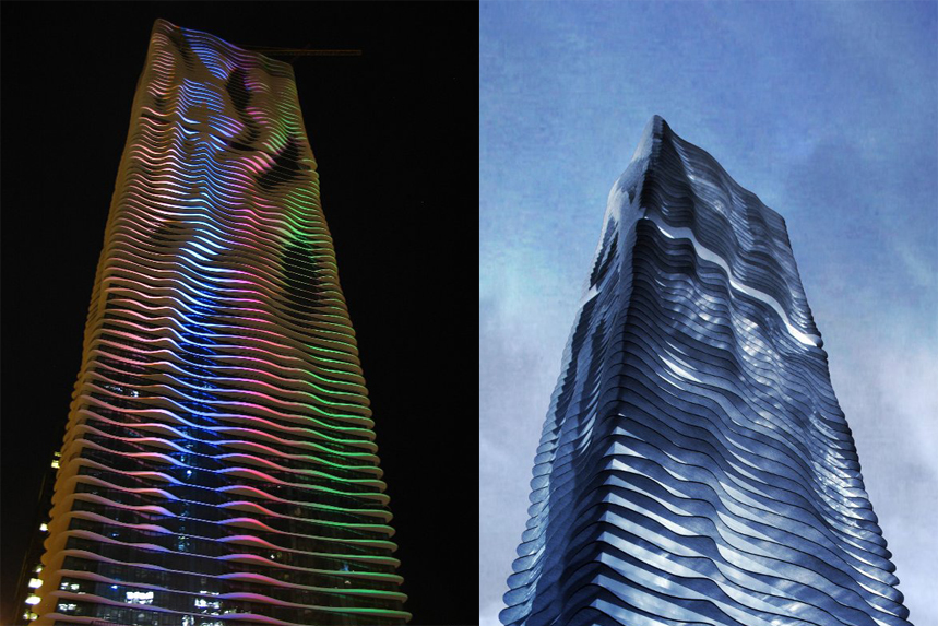 愛克瓦大廈(Aqua Tower,Aqua有“水”的意思)借助一些準(zhǔn)則,如視線、遮陽和功能,來控制建筑外輪廓的豎向體系。整個(gè)建筑看起來像一個(gè)巨型雕塑。大廈強(qiáng)有力的形體猶如裸露的石灰?guī)r層,并體現(xiàn)了那種塑造大湖區(qū)域的地質(zhì)力量。比較有意思的是,該大廈動(dòng)物權(quán)利組織PETA的一個(gè)“鳥類友好設(shè)計(jì)”的獎(jiǎng)項(xiàng)。 通過波浪形的室外設(shè)計(jì)和方便鳥類識別的帶有灰色記號的燒結(jié)玻璃的使用,甘建筑工作室創(chuàng)造了一個(gè)能幫助阻止鳥類撞向玻璃窗的設(shè)計(jì)作品。PETA的Proggy獎(jiǎng)用來獎(jiǎng)勵(lì)在經(jīng)濟(jì)和文化方面對動(dòng)物友好上的貢獻(xiàn)。如此建筑只要簡單的建筑亮化就能讓建筑本身熠熠生輝。