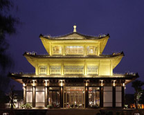 該項(xiàng)目由B+H建筑師事務(wù)所設(shè)計(jì),作為中國第一婚慶鉆石宮,以其如夢如幻的設(shè)計(jì)打動(dòng)了諸多喜結(jié)連理的新人和大批前來觀光的游客。禮堂的內(nèi)部設(shè)計(jì)融合了優(yōu)雅與永恒的元素,材料采用爵士白大理石、鏡面不銹鋼和全透明鋼化玻璃等。禮堂頂部懸掛多盞形如鉆石戒指的水晶吊燈,在透明的切割面玻璃屋頂?shù)挠骋r下,為婚禮慶典傳遞出神圣而美好的主題。禮堂擺設(shè)的透明聚酯座椅由 Karim Rashid設(shè)計(jì),配合禮堂內(nèi)部的整體布局,突出純凈而和諧的意味。