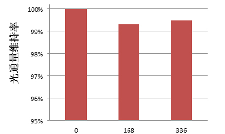 老化條件為 85℃&85%RH,老化過程中樣品以 540mA 電流點(diǎn)亮,分別 在 0h、168h 和 336h 進(jìn)行光色電性能測試,其光通量維持率如圖 7 所示。