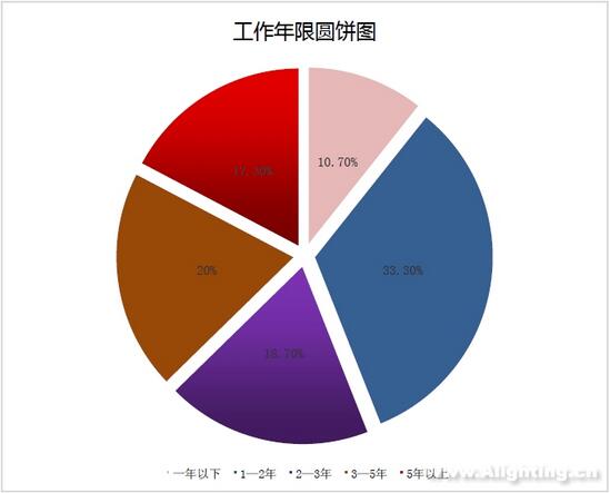 從工作年限來看,此次受訪者工作年限分布較為平均,其中1-2年的占比最多,為33.3%。另外,工作時間在三年內(nèi)的工程師占了大部分,而工作年限在5年以上的僅占17.3%。由此也反映出目前照明行業(yè)內(nèi)缺少資深級別的工程師,這也是照明業(yè)內(nèi)普遍缺少技術(shù)創(chuàng)新的重要原因之一,若要創(chuàng)新還需建立在一定的行業(yè)積累上。