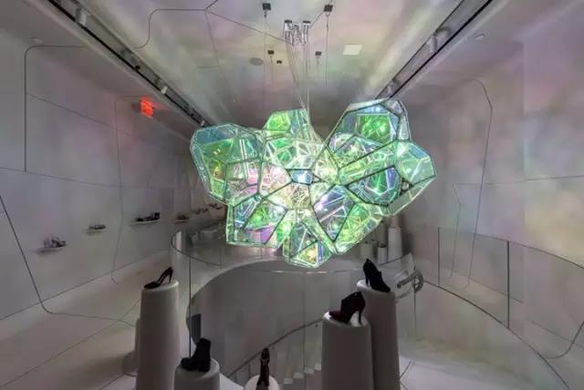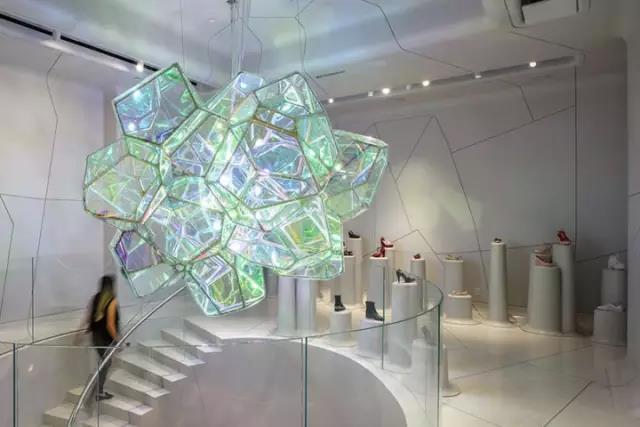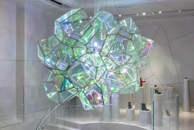 這件作品是SOFTlab與Melissa合作為其紐約曼哈頓門店設(shè)計(jì)的主題為“ Star Walker ”的裝置作品,為顧客營造出了一個(gè)賞心悅目的購物環(huán)境。裝置是由水晶制成,每一塊都好似水晶的切割面,閃爍著五彩的光暈。這些水晶裝置分布在店內(nèi)不同的地方,都是由天花板垂下,遠(yuǎn)看就像是萬花筒中的琉璃花。