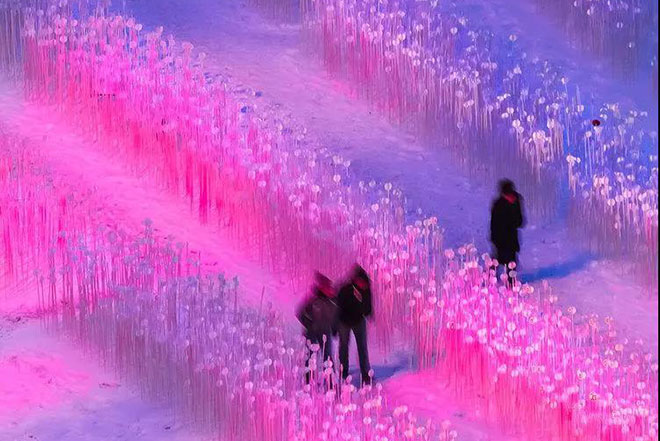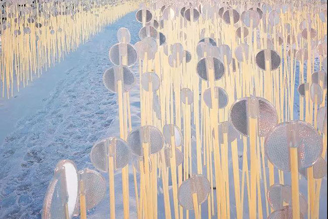 該項(xiàng)目的設(shè)計(jì)是從魁北克的麥田里得到靈感的,當(dāng)小麥迎著微風(fēng)左右擺動(dòng)時(shí),景色尤其美麗。由麥田浮動(dòng)而生的Entre les rangs裝置是由成千個(gè)靈活柔韌的莖管組成,管狀結(jié)構(gòu)頂部附有一個(gè)白色的反光膜,這些反光膜利用周圍的景觀刺激可以不斷移動(dòng)變換,充滿活力與動(dòng)感。
