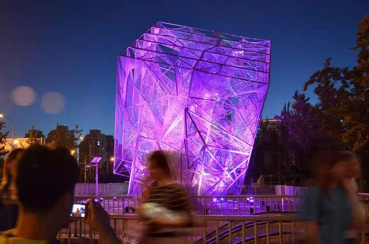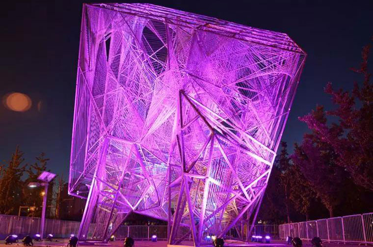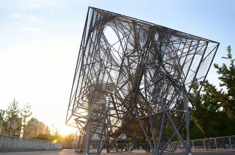 “線立方”是參加2013年中國國際建筑藝術(shù)雙年展的作品之一,展覽地點位于中國北京國際體育場附近,是由來自洛杉磯的Oyler Wu聯(lián)合設計,整個構(gòu)筑物約16米高,像一個三維編織的掛毯,整體架構(gòu)全部由金屬框架支撐,而且提供了與眾不同的感官體驗,整個結(jié)構(gòu)從各個角度觀賞有不同的變化。