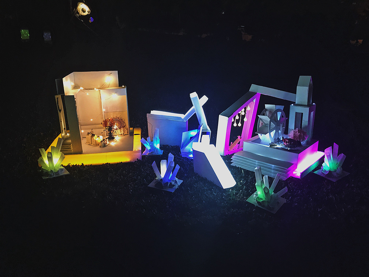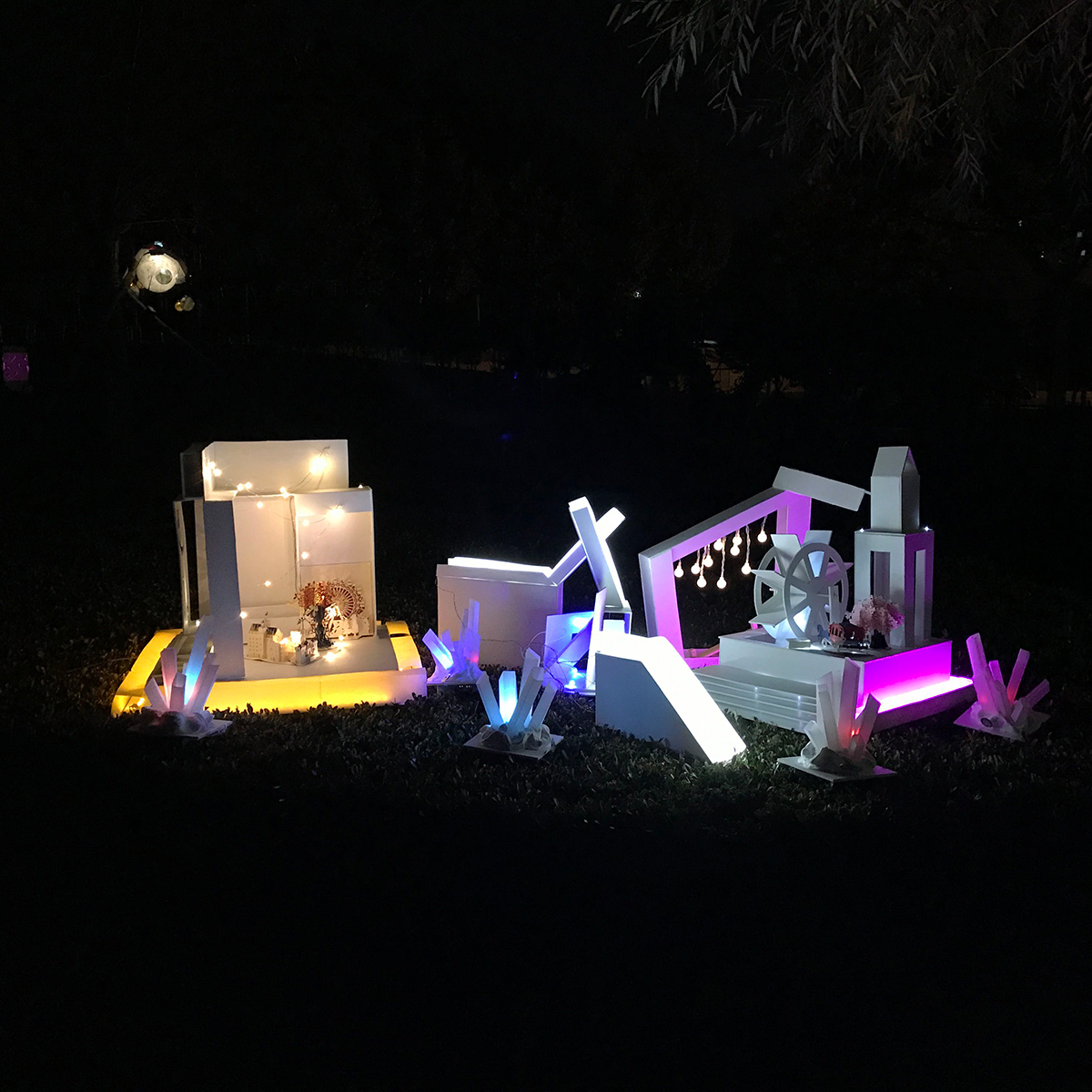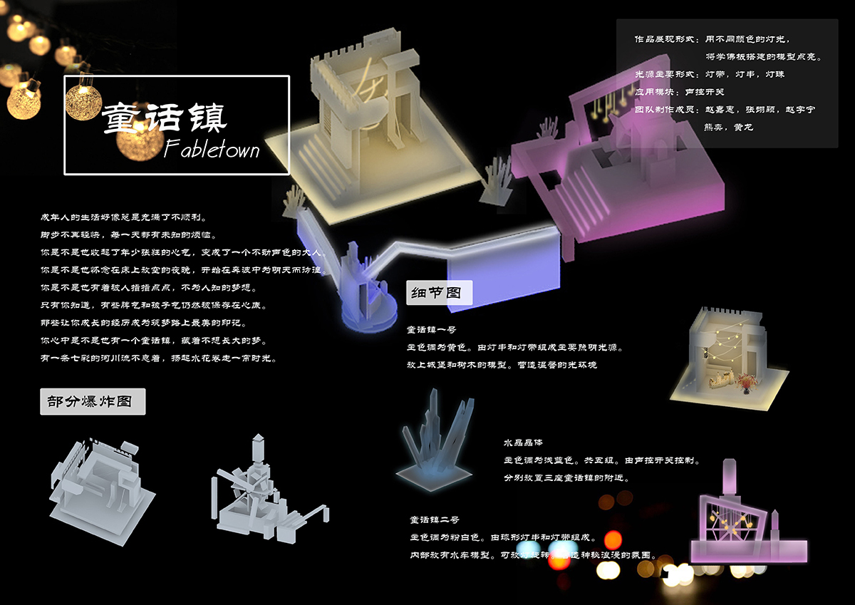 一座童話(huà)鎮(zhèn),由三座城堡相互連接,通過(guò)電路和機(jī)關(guān)設(shè)置點(diǎn)亮整組城堡。利用類(lèi)似旋轉(zhuǎn),拼接的機(jī)關(guān),通過(guò)一條道路鏈接三座城,道路需全部連接在一起才能點(diǎn)亮。 城堡用白色的雪佛板搭建而成,分別用黃,藍(lán),粉色led燈帶打亮,連接道用白色燈帶,再用暖白色燈珠加以裝飾。三座城堡分別象征權(quán)利富貴,溫馨浪漫,自由隨性,寓意每個(gè)人都有不同的追求,無(wú)論選擇了哪條路,堅(jiān)持走下去,都會(huì)擁有一個(gè)多彩的人生。