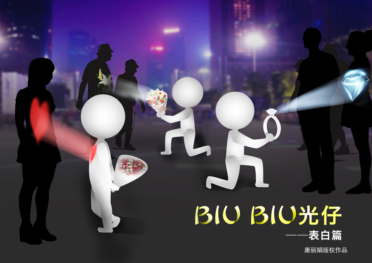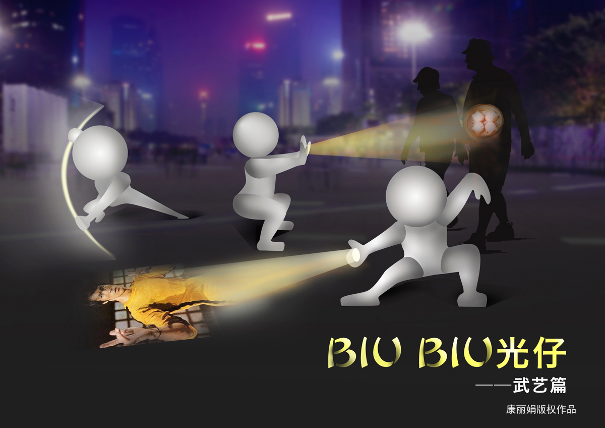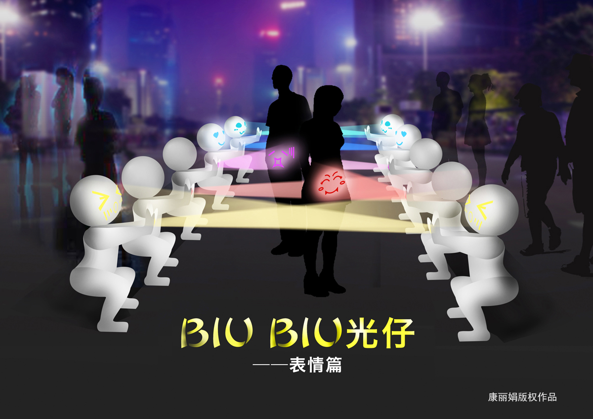 以簡潔的原創(chuàng)Biu Biu光仔為設(shè)計(jì)載體,通過形象的武術(shù)動(dòng)作,配合動(dòng)態(tài)的光影效果展示廣東傳統(tǒng)的武術(shù)精神和廣州的特色美食。設(shè)計(jì)由三個(gè)Biu Biu光仔組成,一個(gè)為武打動(dòng)態(tài)為主,手中以光為武器展示武藝和光藝的結(jié)合。另一個(gè)為下蹲姿勢,當(dāng)人們走近Biu Biu光仔時(shí),手掌則投射在游客身上廣州特色美食的動(dòng)態(tài)光影。最后一個(gè)則投影在地面動(dòng)態(tài)的展示廣東的武術(shù)大師風(fēng)采(如李小龍、葉問、黃飛鴻等)。