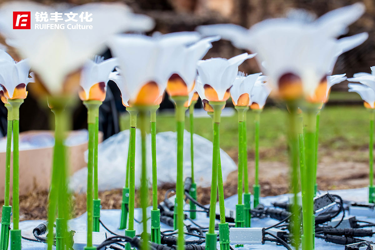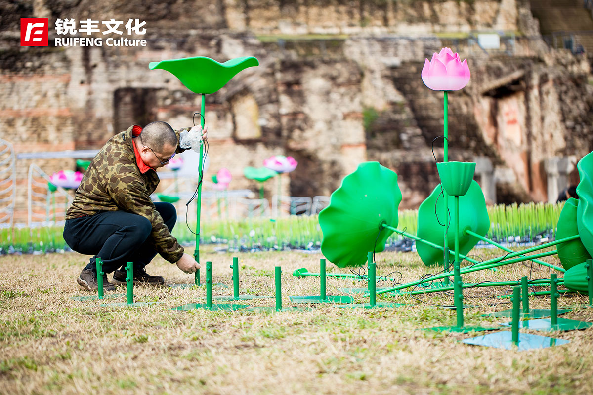 這時(shí)候,草坪上的芭蕉葉陣列開始明滅的蕉葉脈絡(luò)變化,草坪上的水系有顏色的變幻,同時(shí)出現(xiàn)雨滴漣漪和魚戲蓮葉游動(dòng)的動(dòng)態(tài)畫面。草坪上四周的荷葉和蓮花也似搖曳生姿,雨打芭蕉的意境和荷塘月色的意境交替出現(xiàn),亦有如一幅云山珠水的濃彩畫卷。