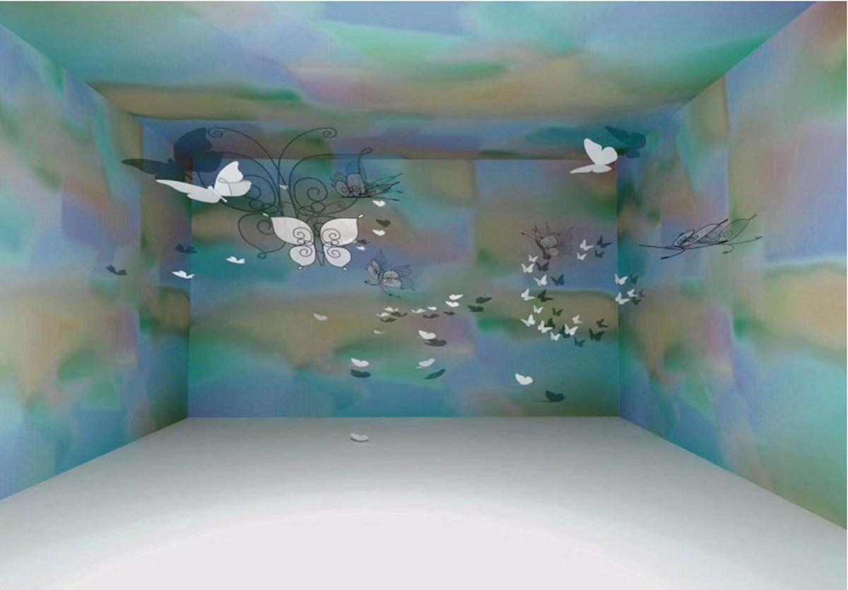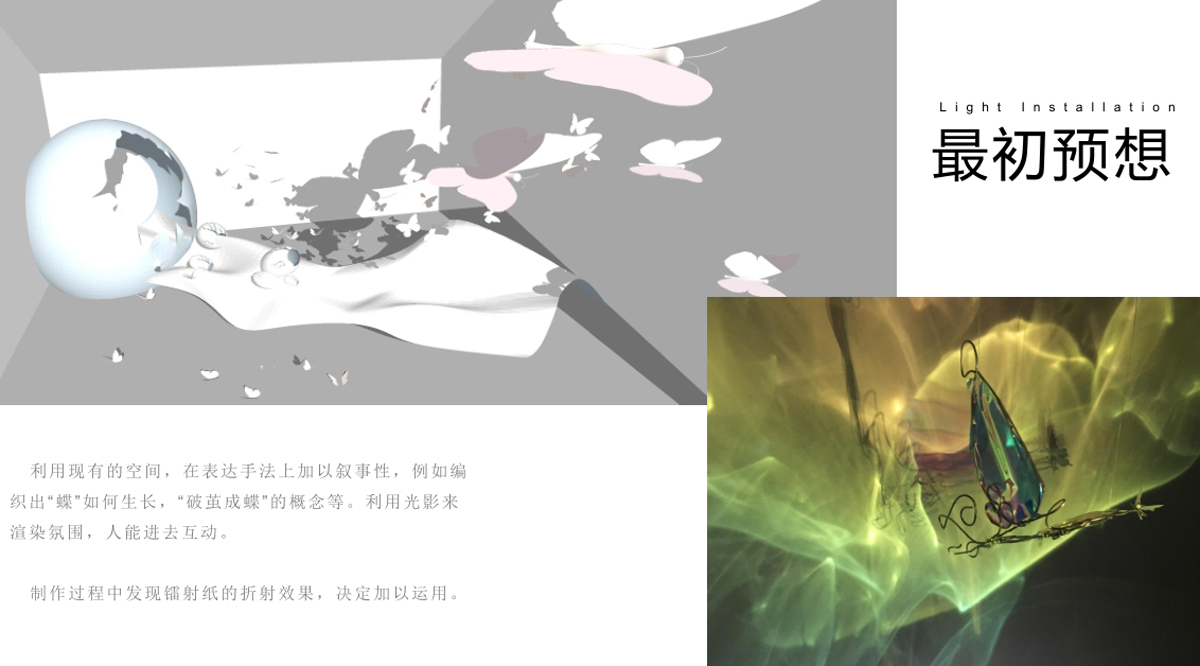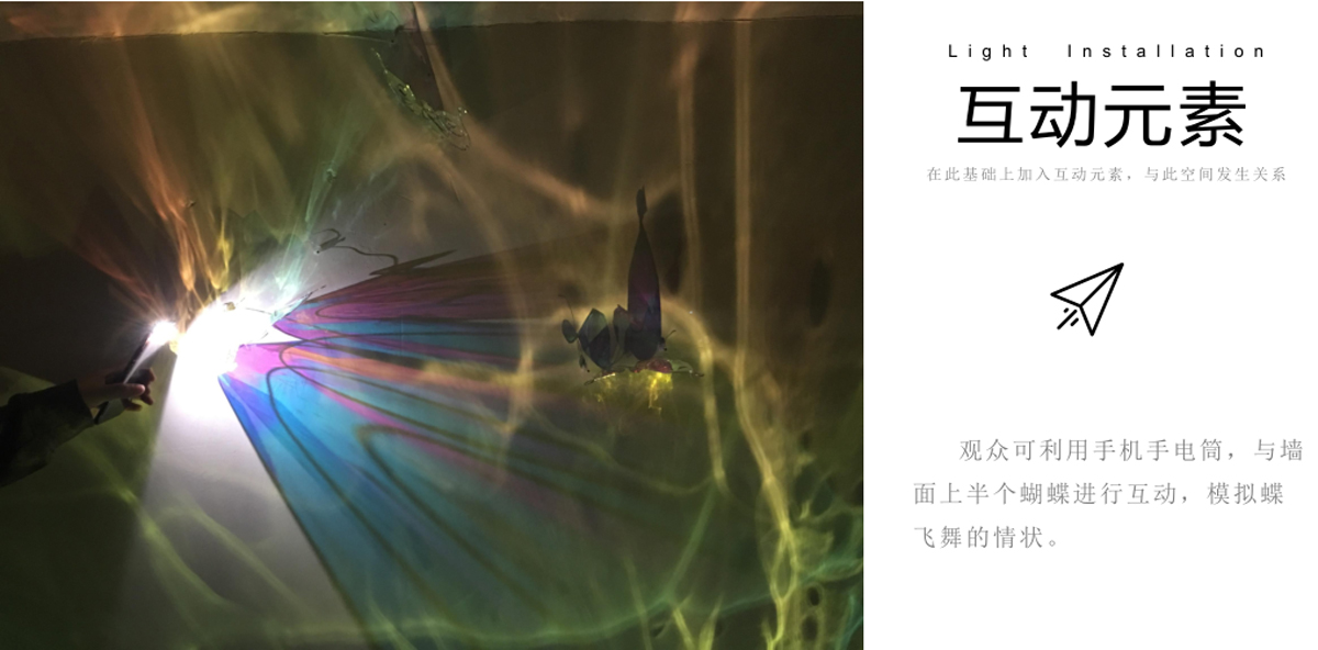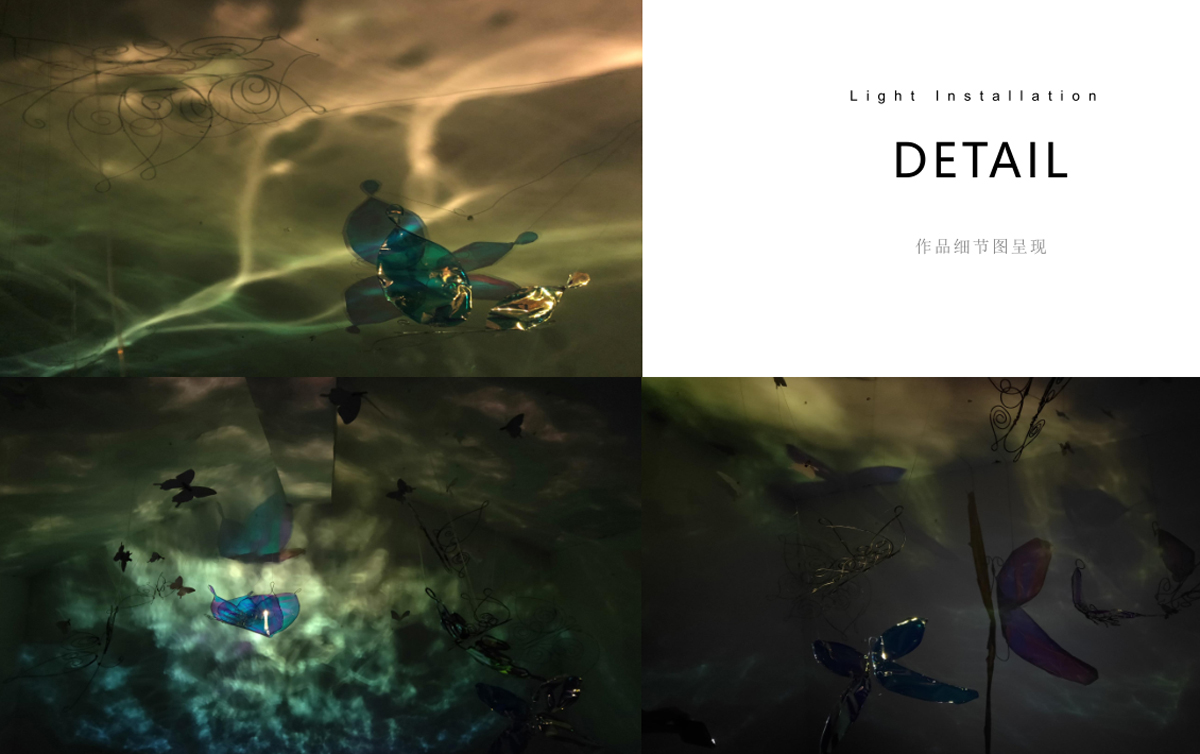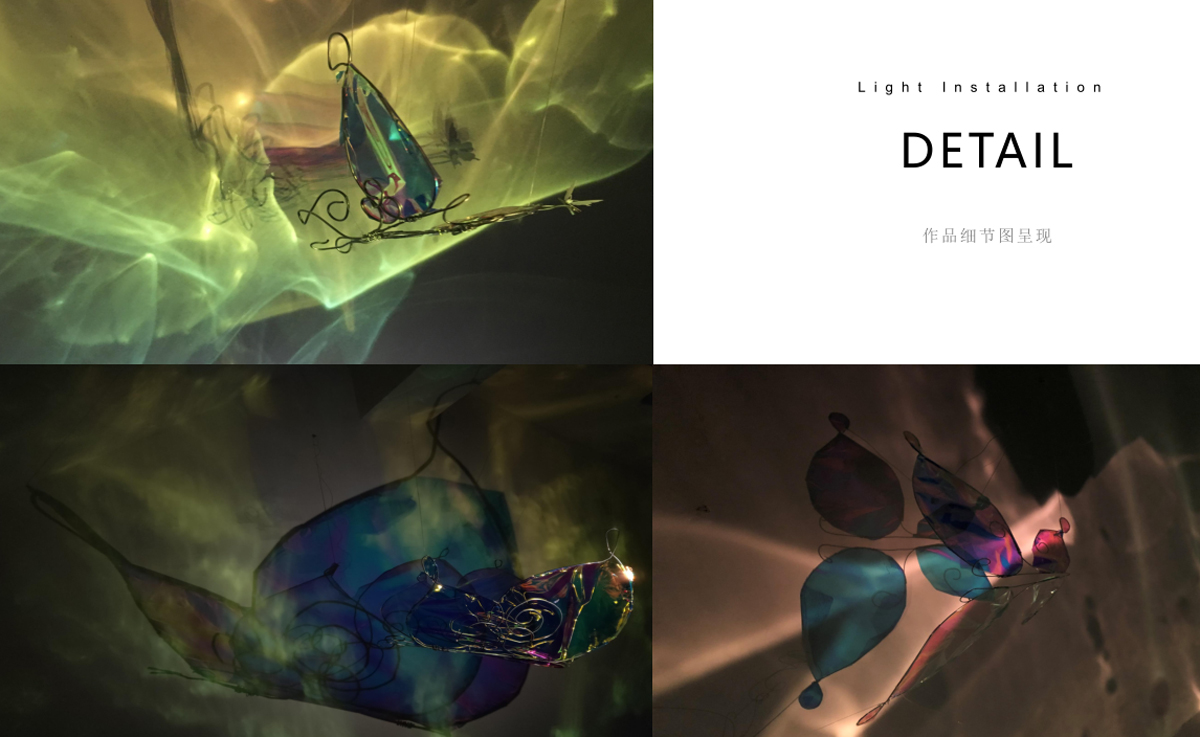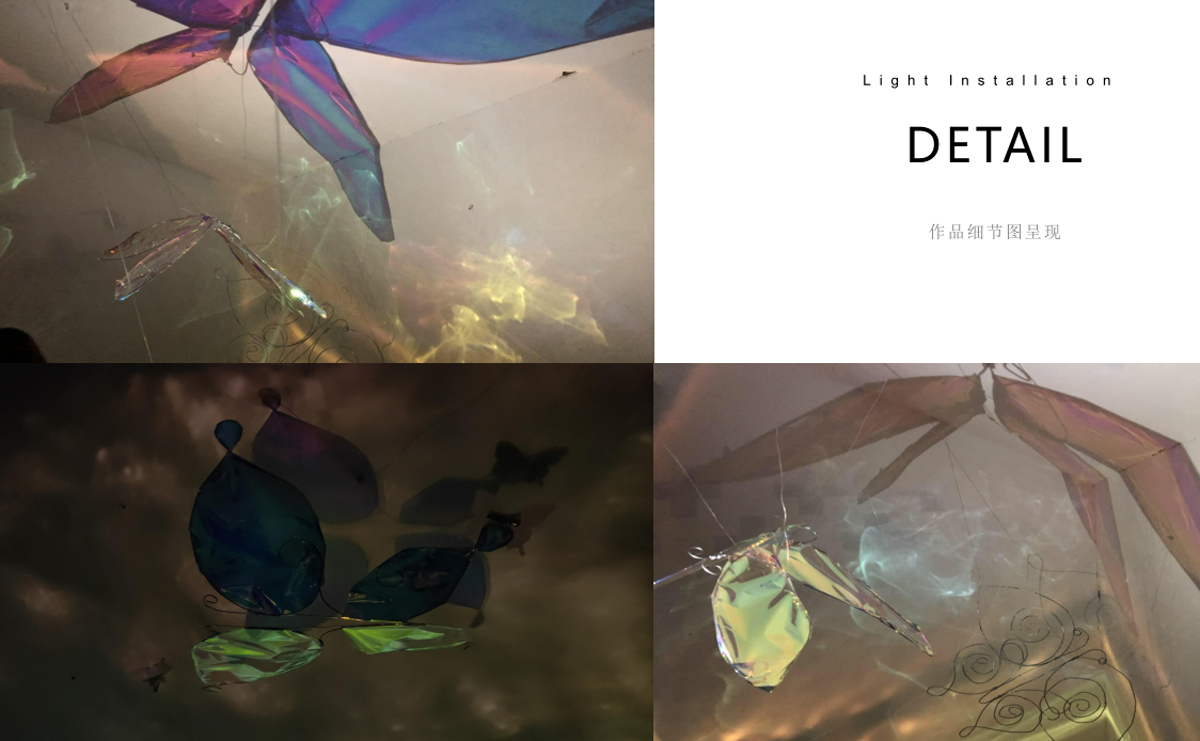 本作品源于“莊周夢蝶”典故,以“蝶”為創(chuàng)作媒介,利用鐵絲編織而成的“蝶”、燈光與鐳射紙結(jié)合的渲染以及音樂的感染,在空間中營造出一種夢幻神秘的氛圍。利用“蝶”的“實(shí)”與光影的“虛”結(jié)合以及利用鐵絲的重來表達(dá)輕盈等手法,從而引發(fā)人思考真實(shí)與虛幻的問題。作品意在將光影設(shè)為主角,實(shí)體的“蝶”僅為輔助,動態(tài)的光影秀與靜止的“蝶”相得映彰,讓人沉浸在這個空間中。
