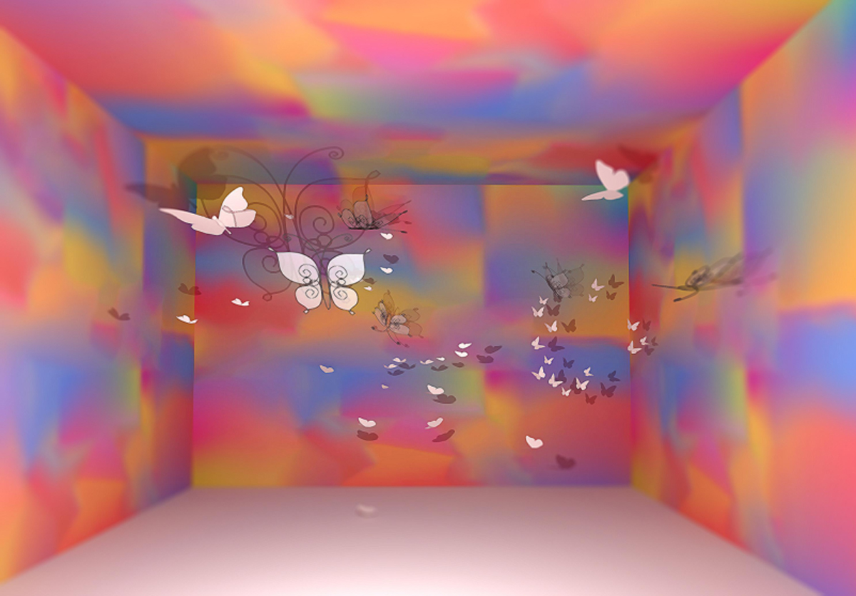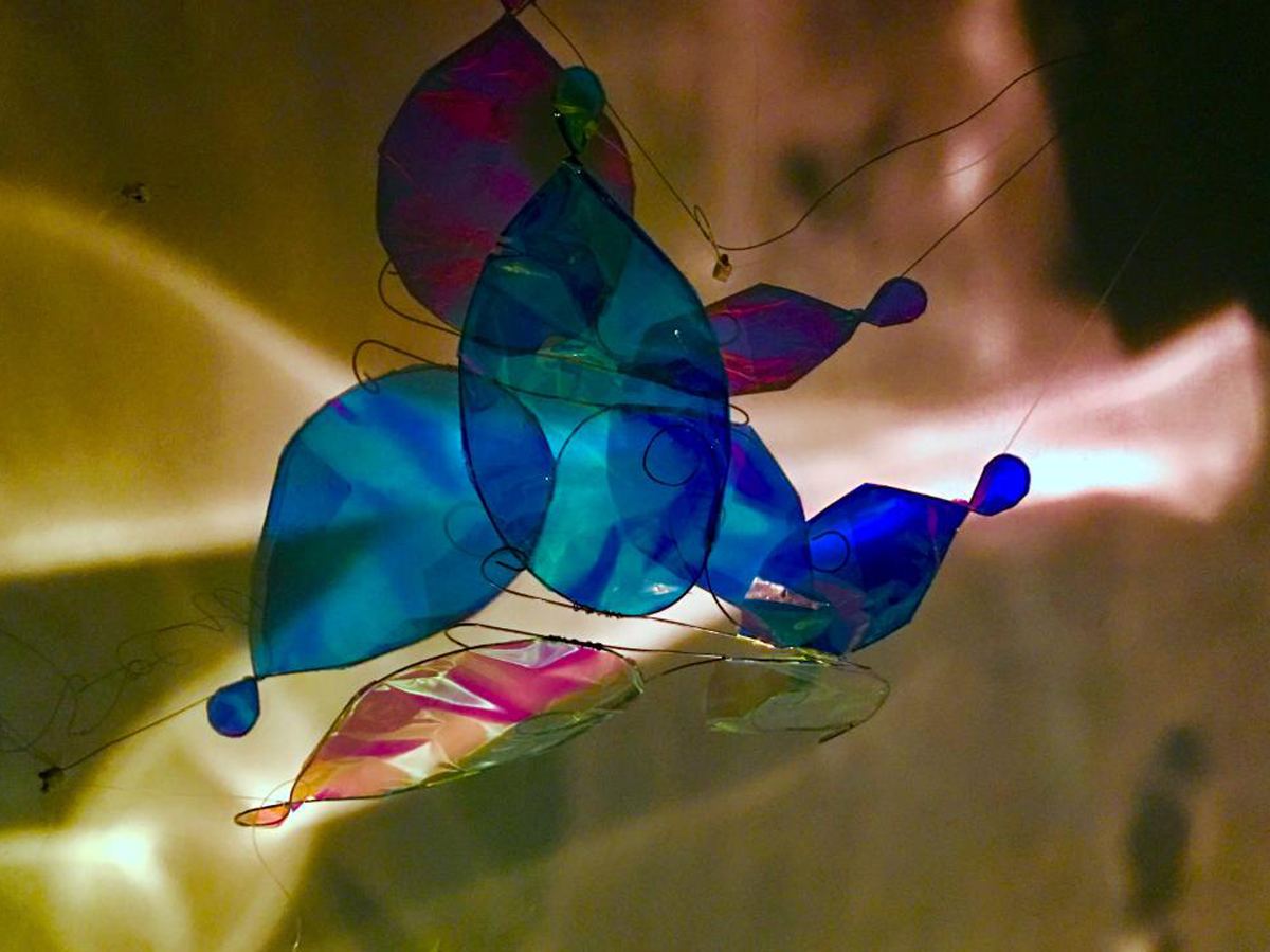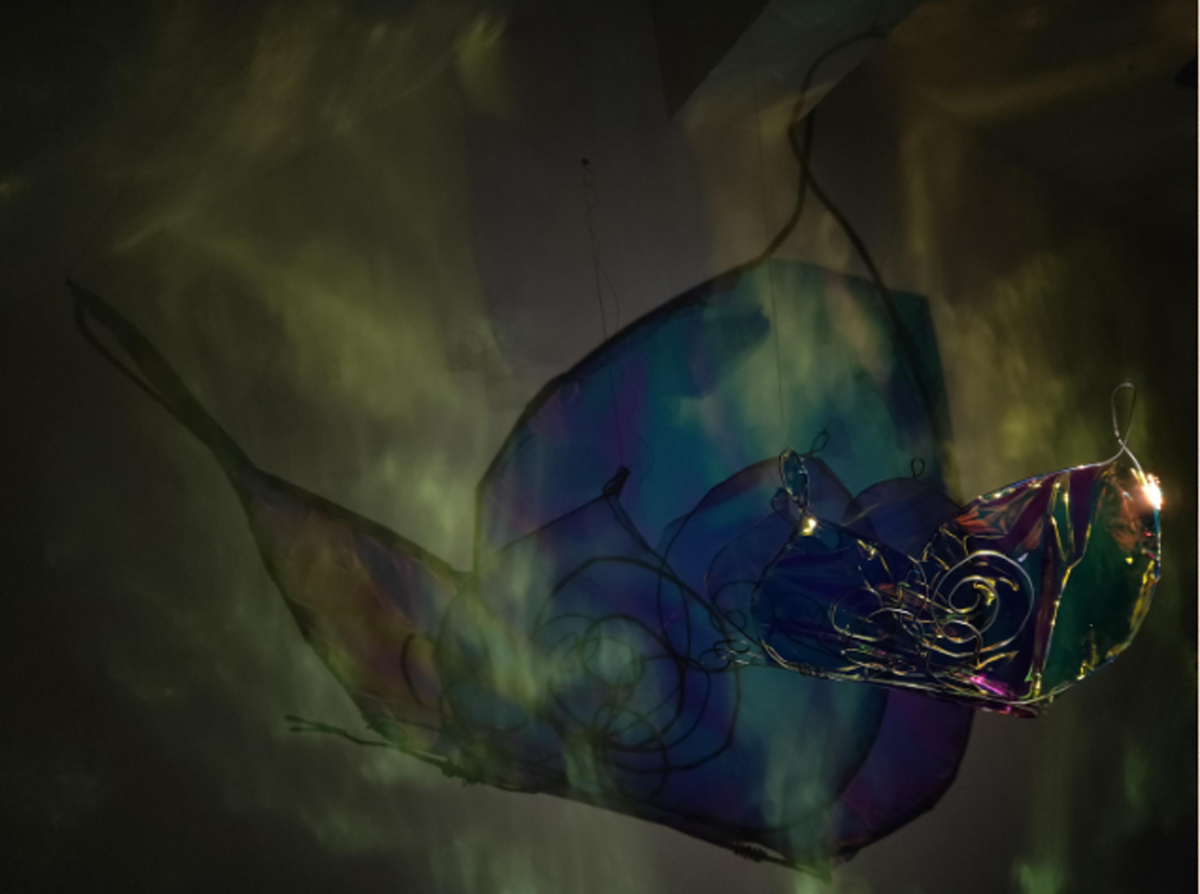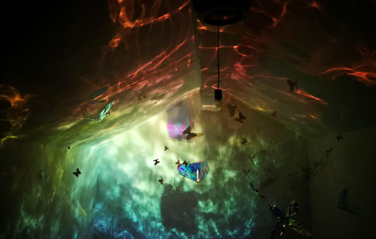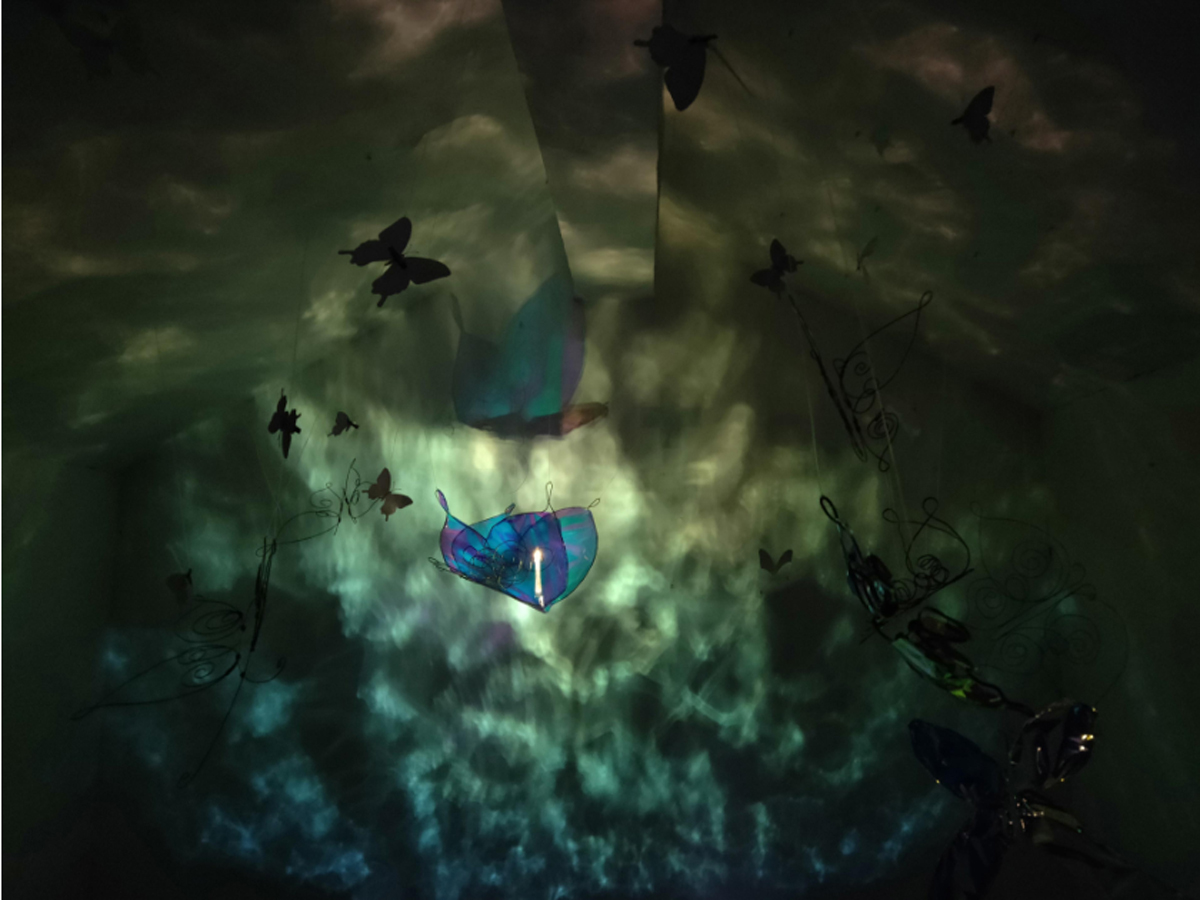 本作品源于“莊周夢蝶”典故,以“蝶”為創(chuàng)作媒介,利用鐵絲編織而成的“蝶”、燈光與鐳射紙結(jié)合的渲染以及音樂的感染,在空間中營造出一種夢幻神秘的氛圍。利用“蝶”的“實(shí)”與光影的“虛”結(jié)合以及利用鐵絲的重來表達(dá)輕盈等手法,從而引發(fā)人思考真實(shí)與虛幻的問題。作品意在將光影設(shè)為主角,實(shí)體的“蝶”僅為輔助,動態(tài)的光影秀與靜止的“蝶”相得映彰,讓人沉浸在這個空間中。