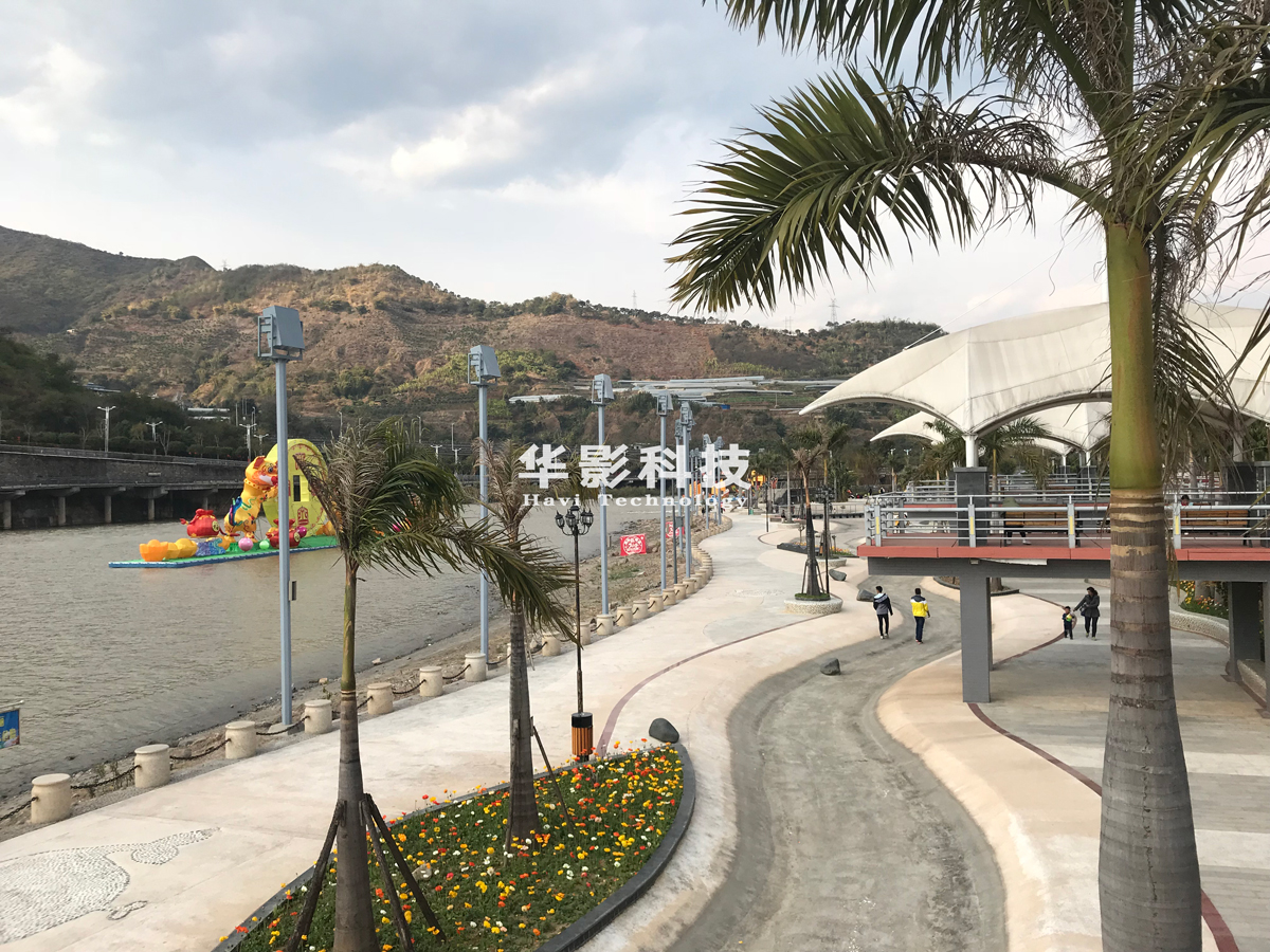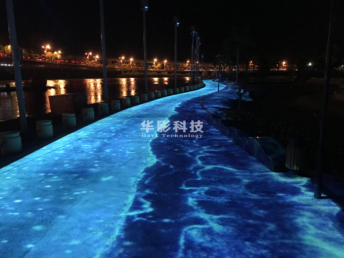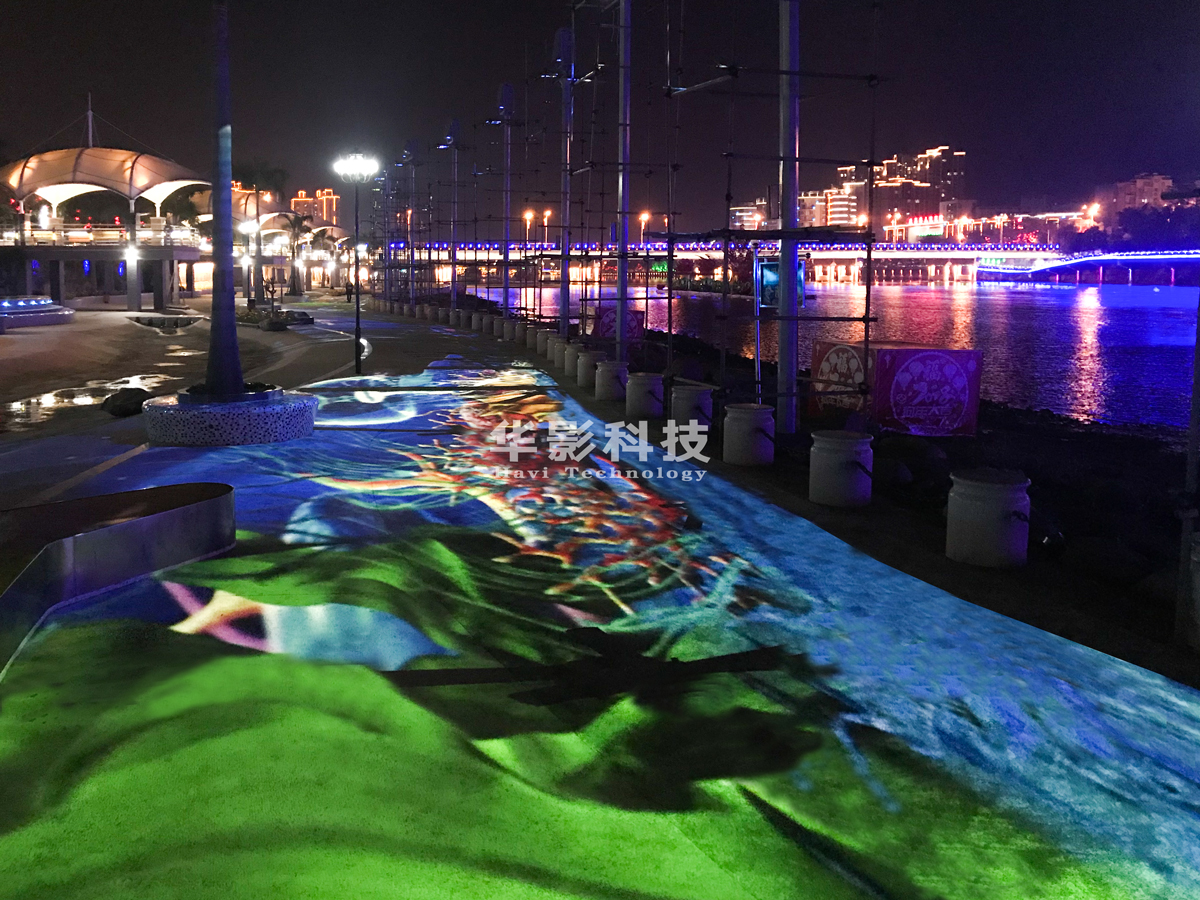 音樂(lè)和音效的配合下,地面上陸續(xù)播放不同的影片,呈現(xiàn)出波濤洶涌的海浪、繽紛花朵以及豐富的海底世界等特效。3D投影畫面設(shè)計(jì)逼真生動(dòng),給人以神奇的視覺(jué)、聲覺(jué)、感覺(jué)體驗(yàn)。