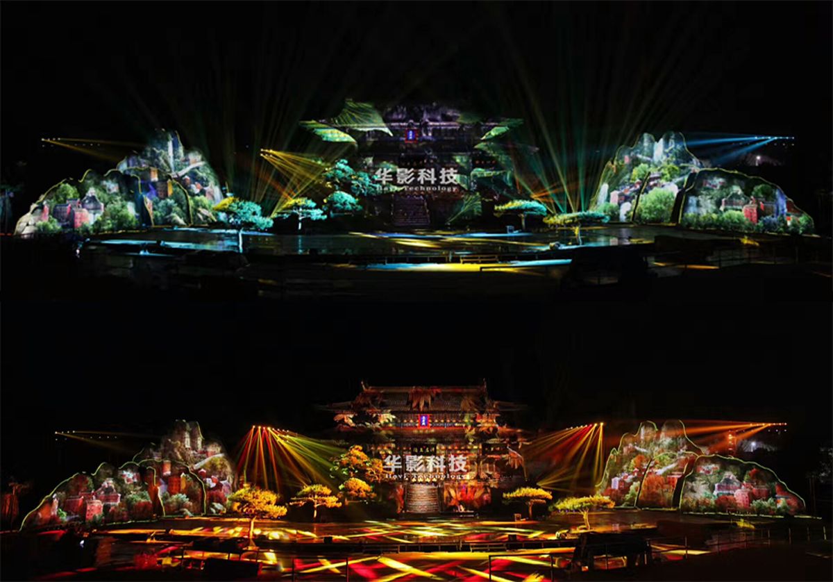 12臺(tái)20000流明投影燈、12臺(tái)8500流明投影燈、2臺(tái)16000流明投影燈融合方式投射。